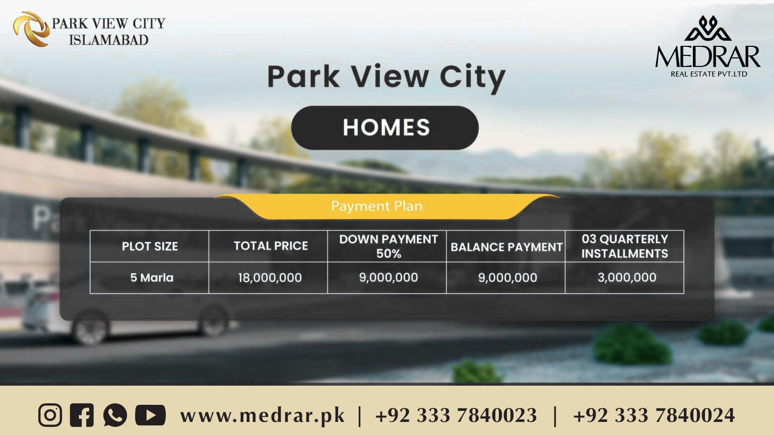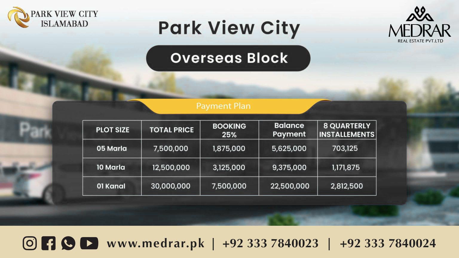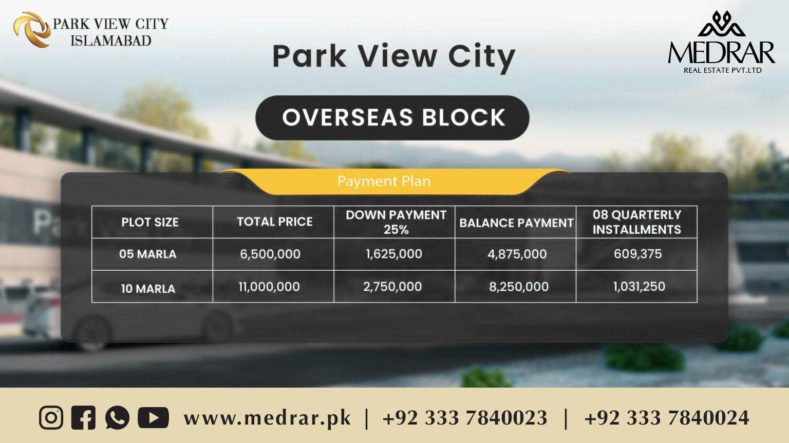 Park View City–Overseas Block is initially offering 5 Marla and 10 Marla Residential Plots with a three-year payment schedule.