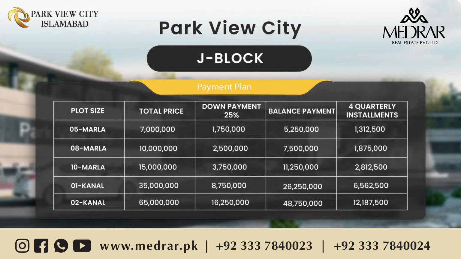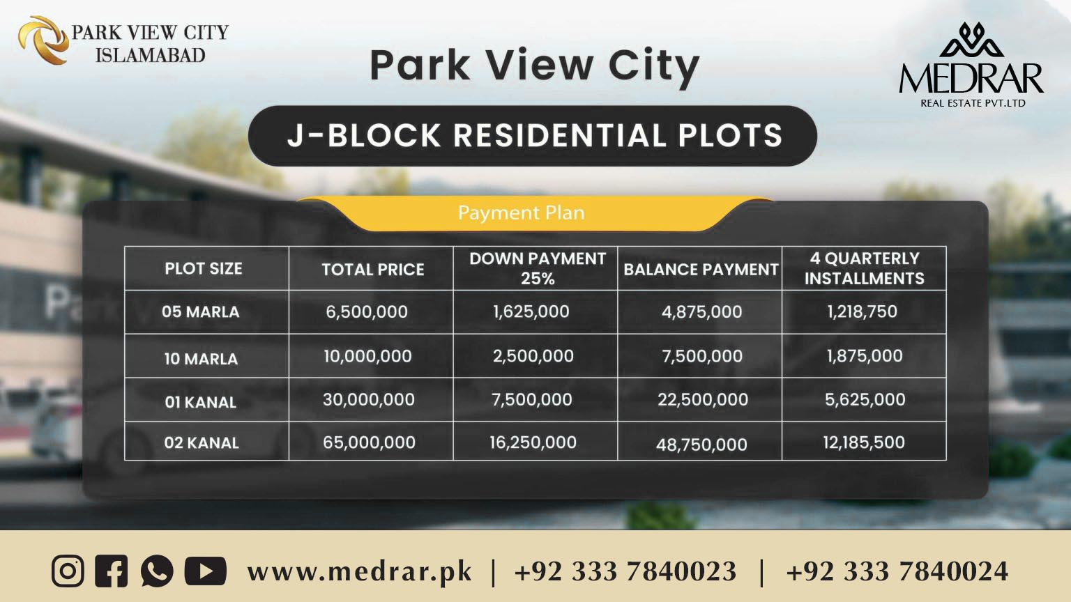 The above-mentioned plots can be booked in Park View City with only 20% down payment. The remaining amount can be paid in 8 equal quarterly installments of 2 years.