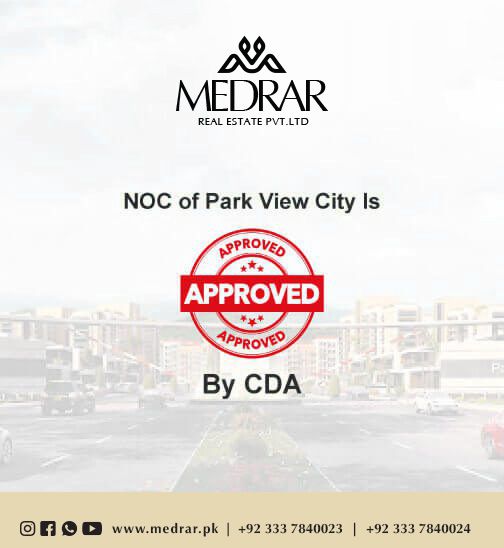 The No Objection Certificate (NOC) of Park View City has been approved by Capital Development Authority (CDA). Park View City is a legal housing society in Islamabad and has been granted complete authorization by the Capital Development Authority.