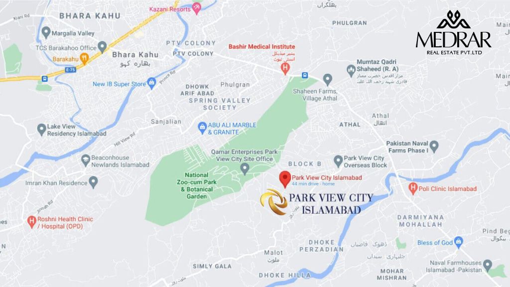 Park View City is conveniently located across the street from Bahria Enclave, 15 minutes from Serena Hotel Islamabad, 5 minutes from Bahria Enclave and Bani Gala, and a 1-minute walk from the lush green botanical Garden, as indicated on the map. On the road to Kashmir Highway, Lehtrar Road, and Islamabad, it is 8 kilometers from Chak Shahzad via Park Road and Kurri Road.